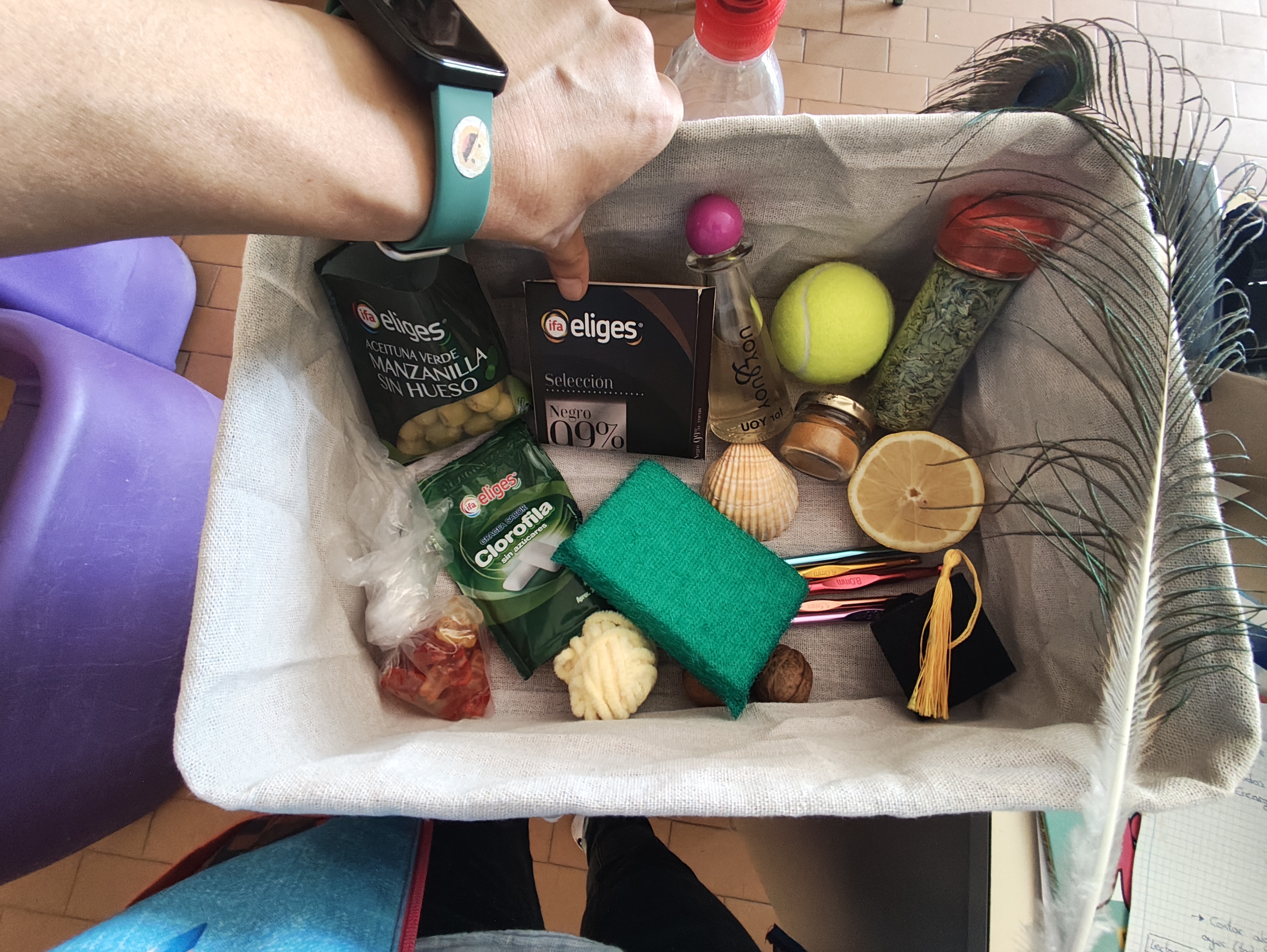 - Tacto: lana muy suave, concha y nueces rugosas, estropajo áspero, agujas de metal frías y forma redonda de la pelota.