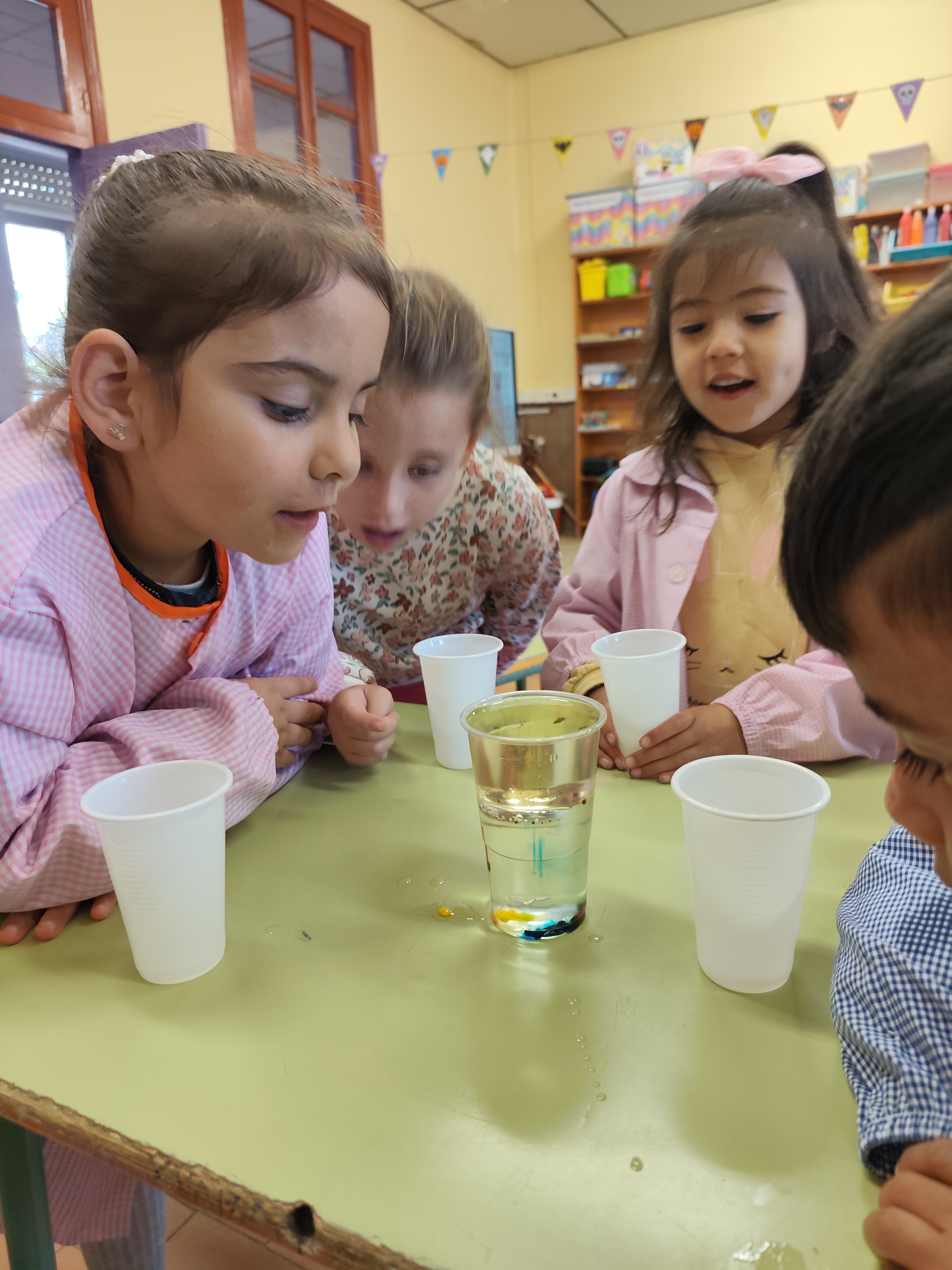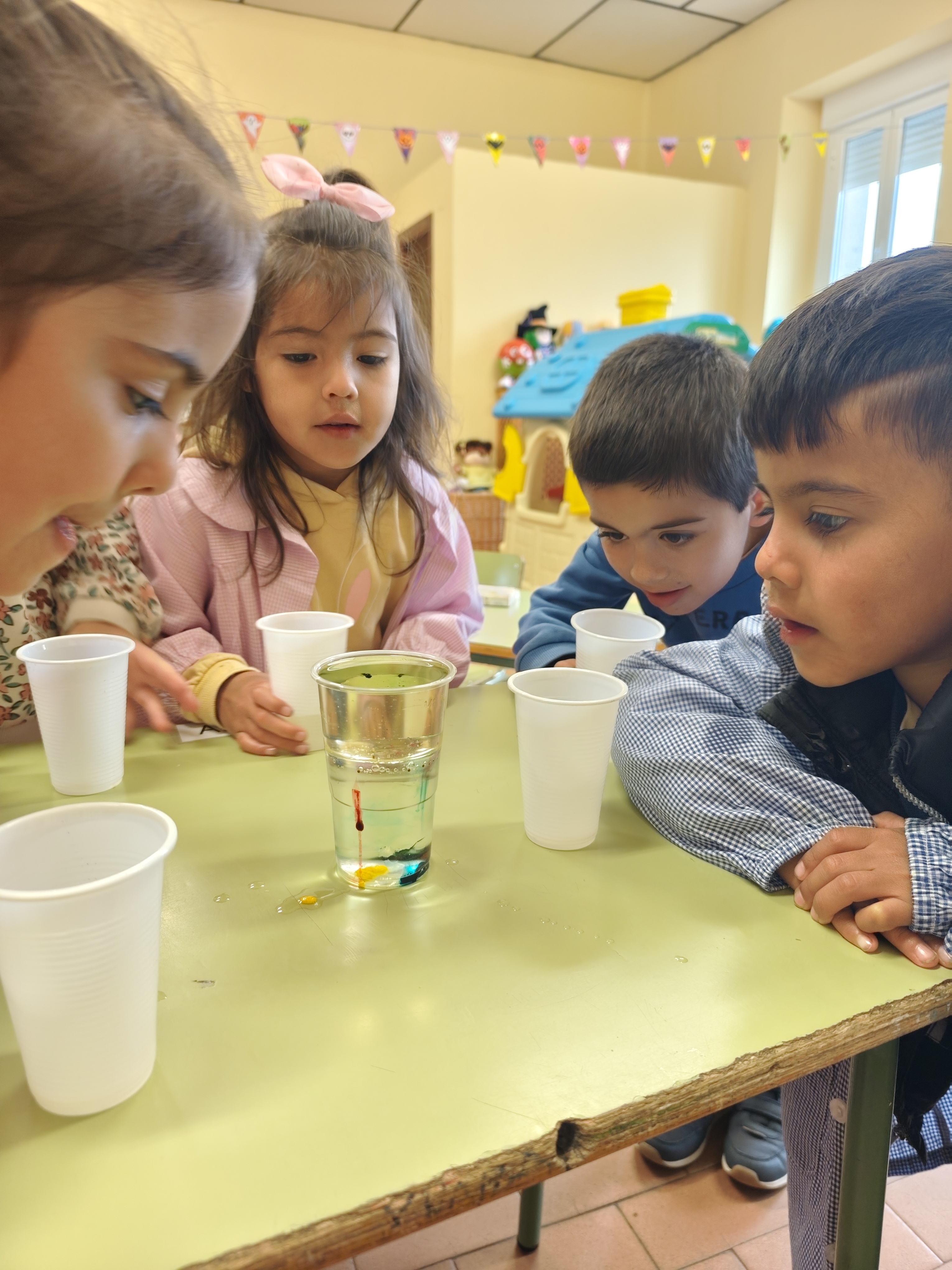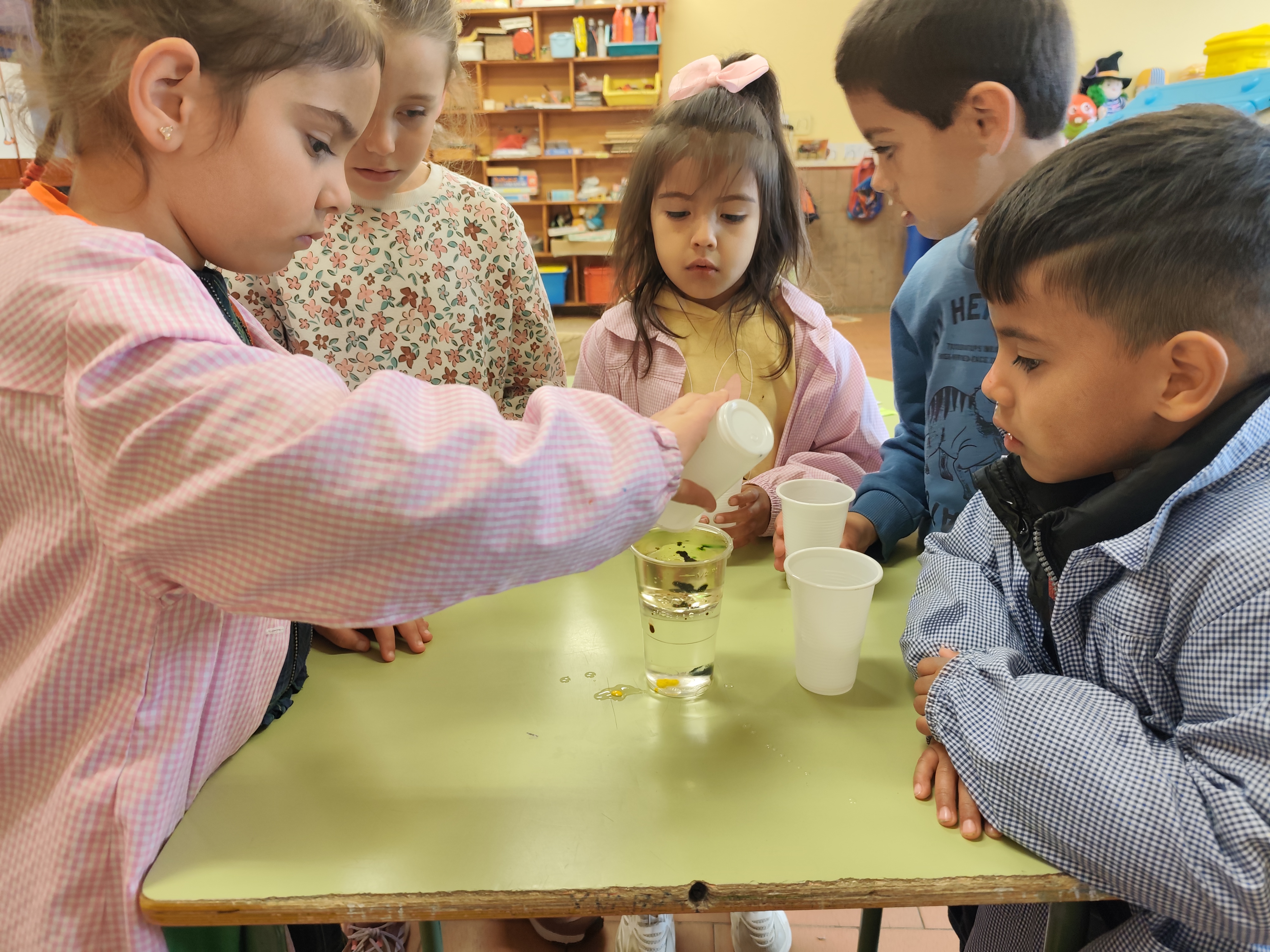 Hemos comprobado (después de mover, mover y volver a mover) que el agua y el aceite no se pueden juntar, parece que sí, pero se separan de nuevo cuando paramos.