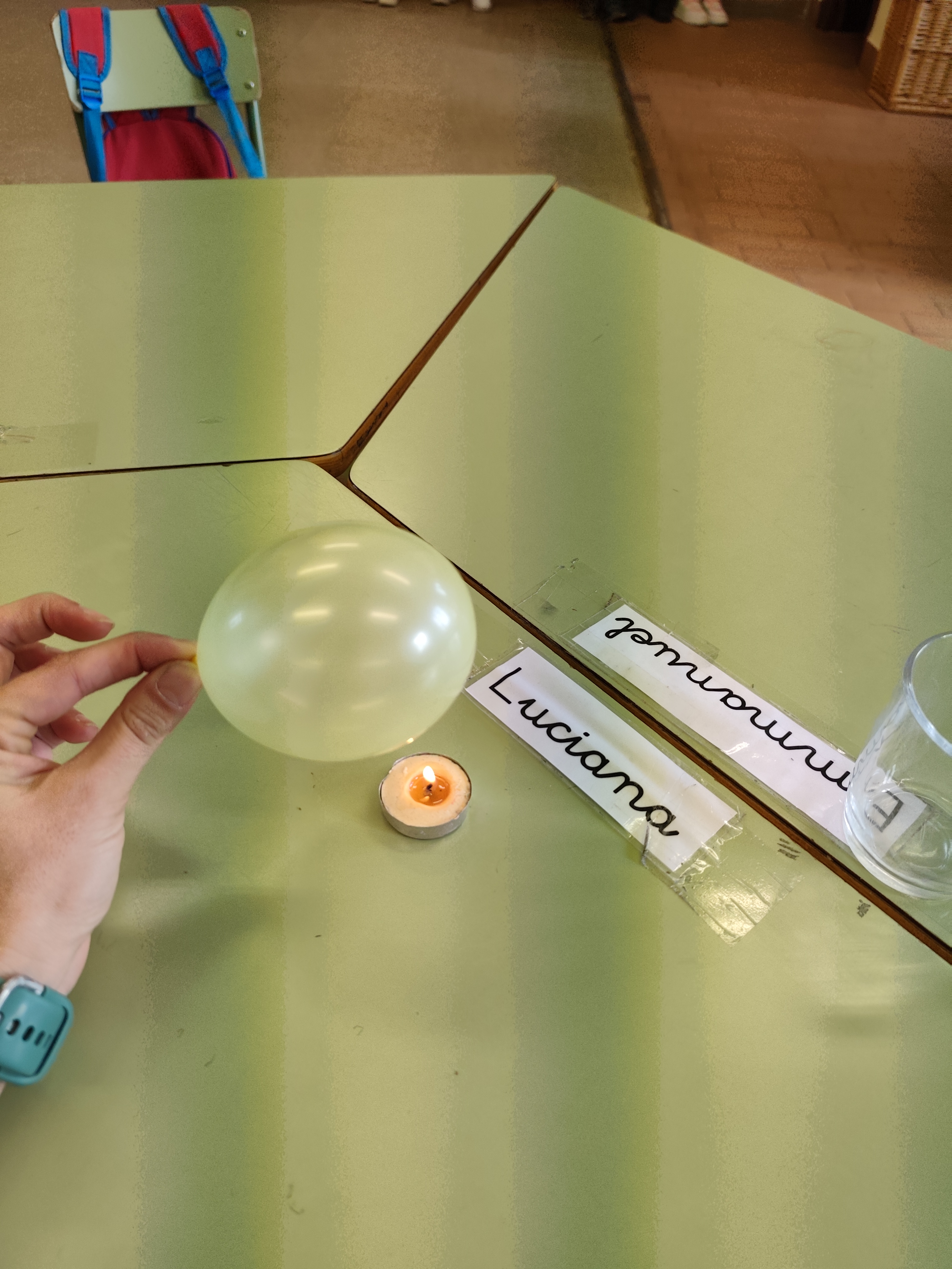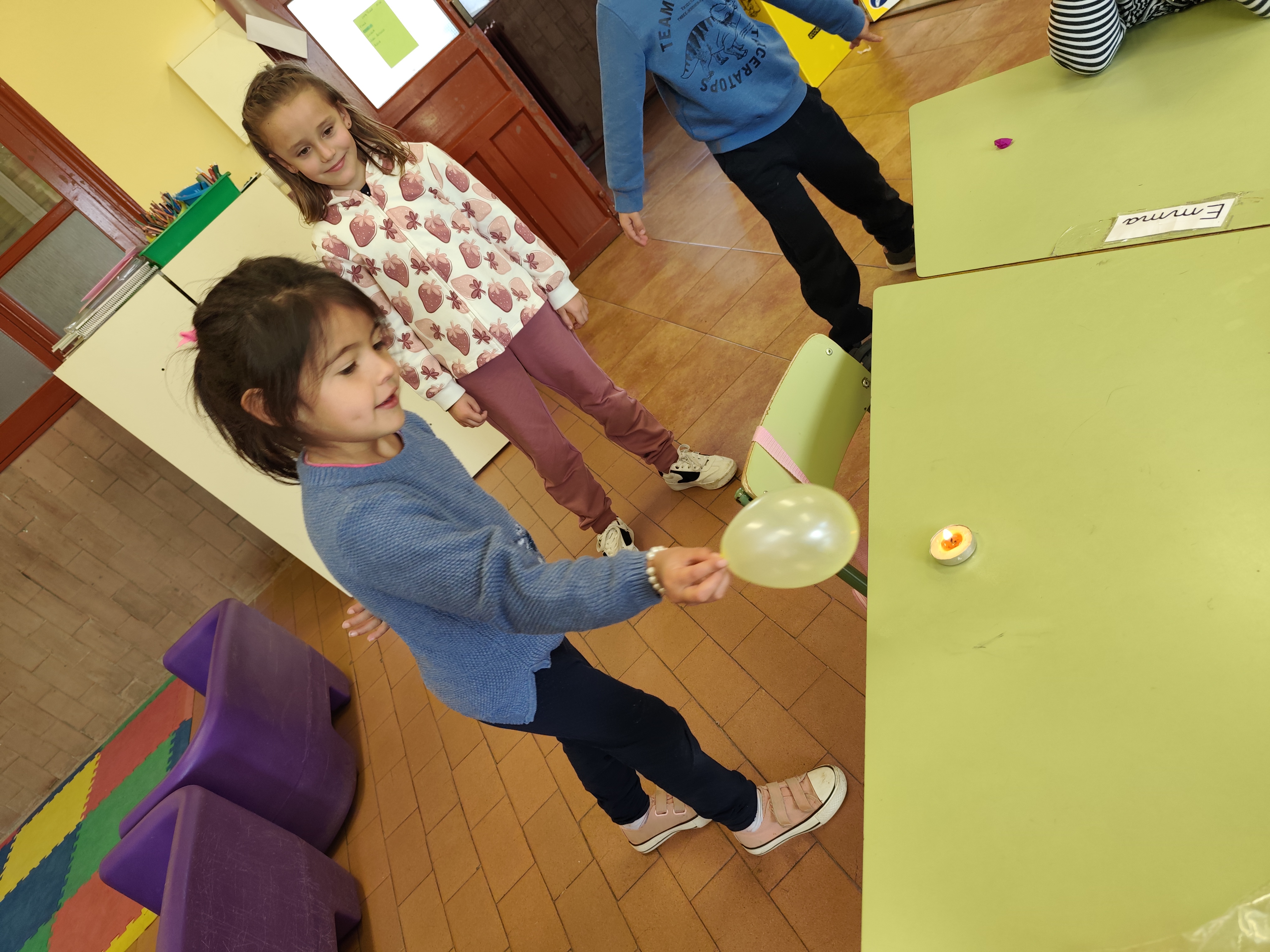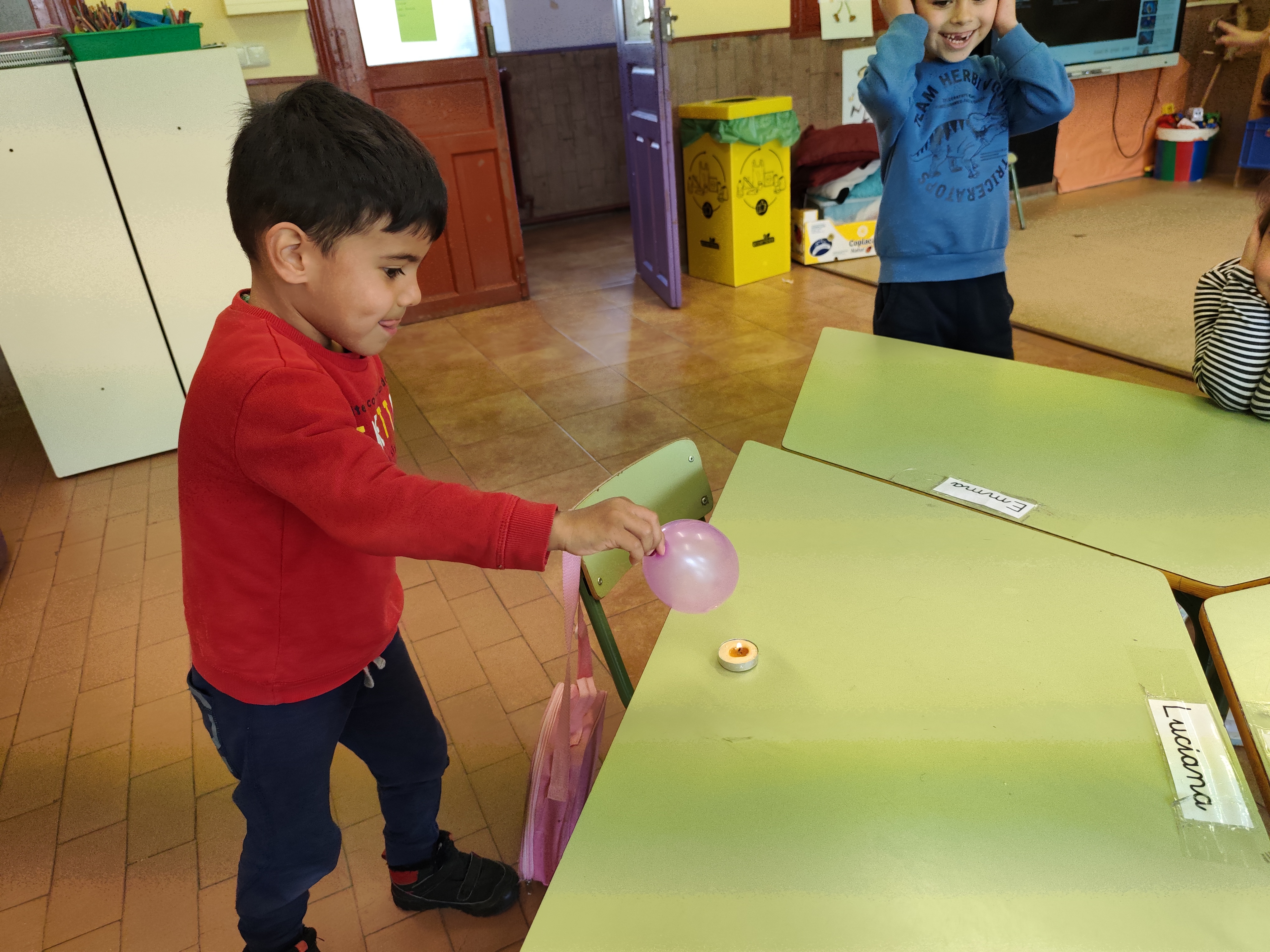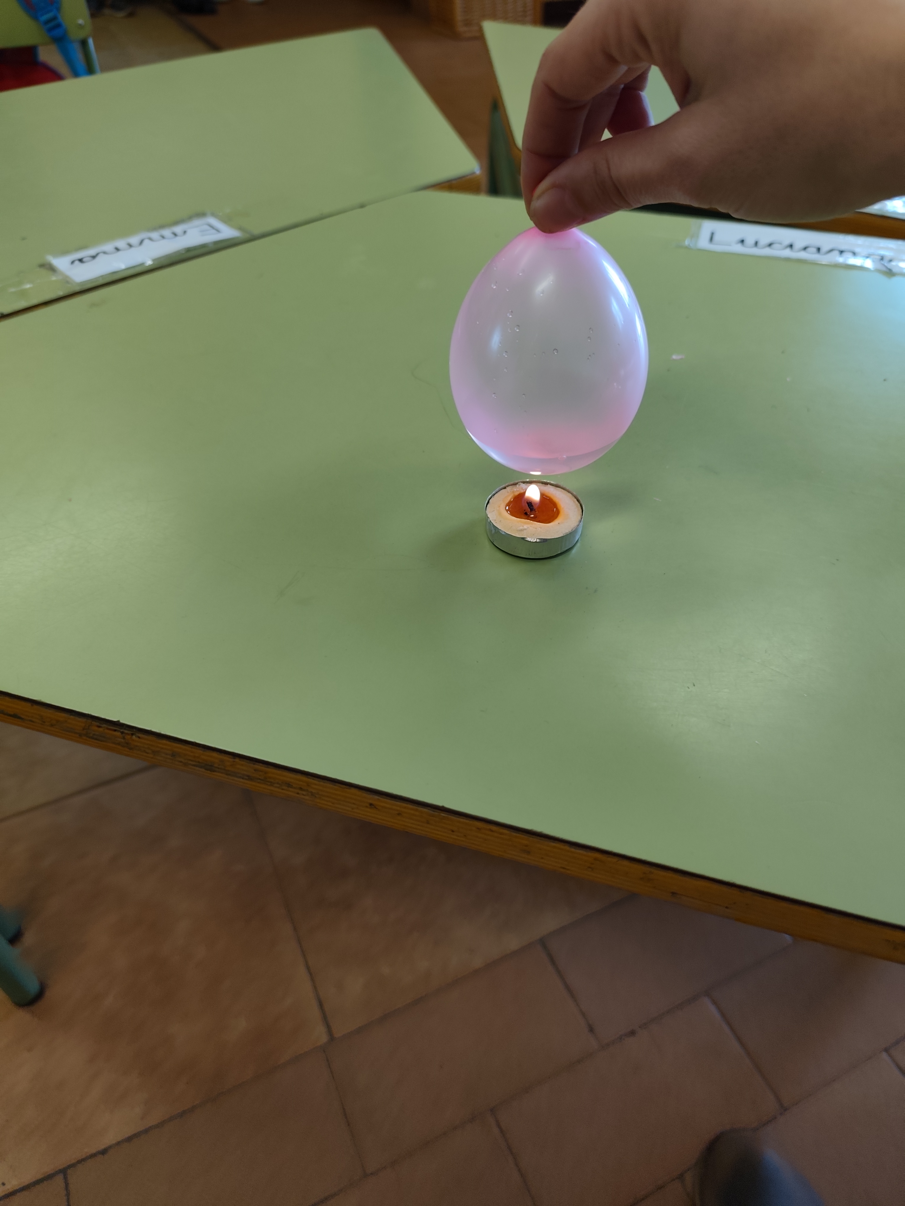 Lo más interesante ha sido que hemos echado un poquito de agua en el globo y hemos vuelto a acercarlo a la vela encendida. Todos pensaban que el resultado iba a ser similar, el globo explota y además lo mojamos todo cuando con el agua que hay dentro. Pero hemos comprobado que no ha sido así y no hemos tenido que secar la mesa, el globo con agua ¡NO EXPLOTA!