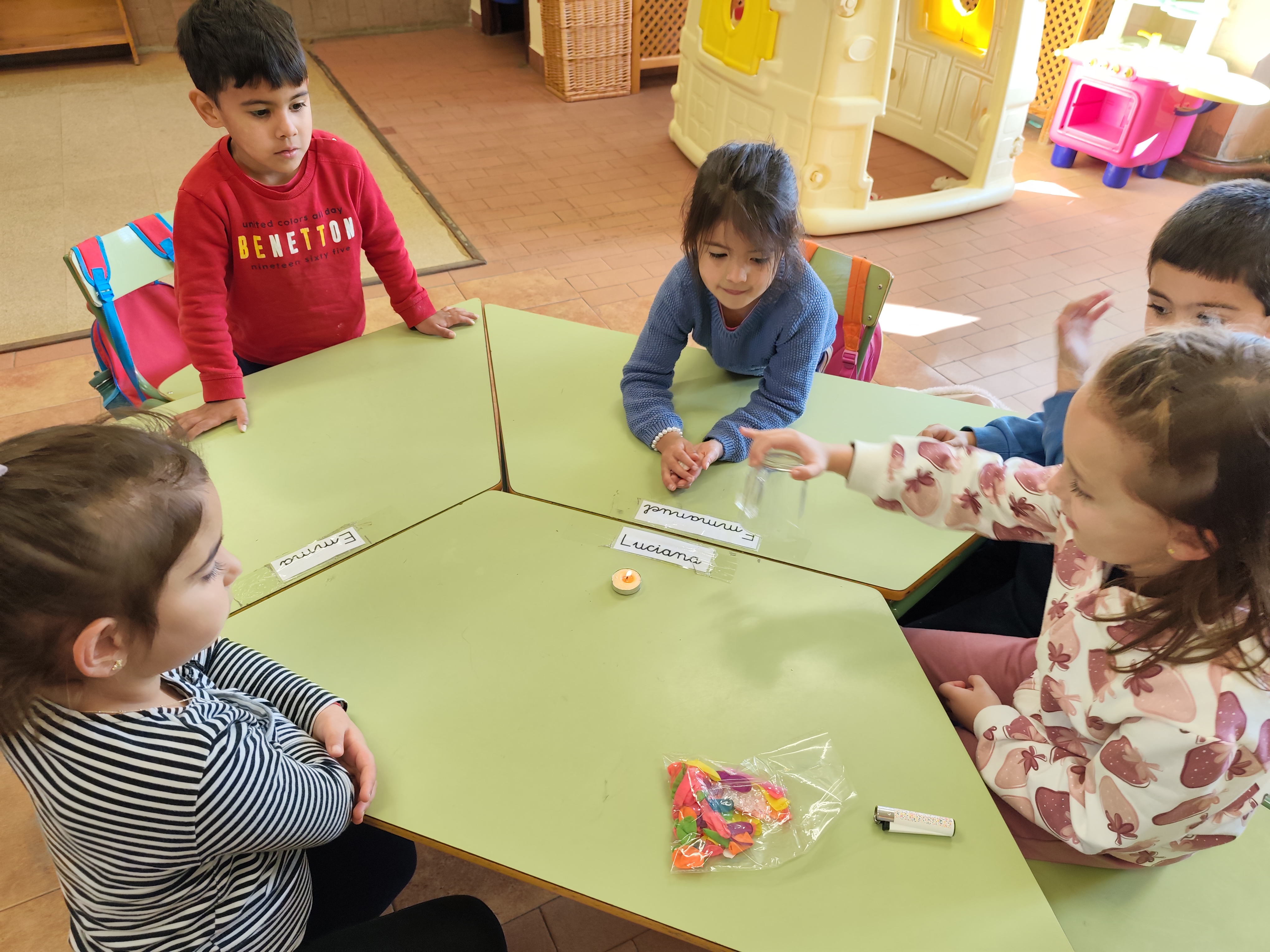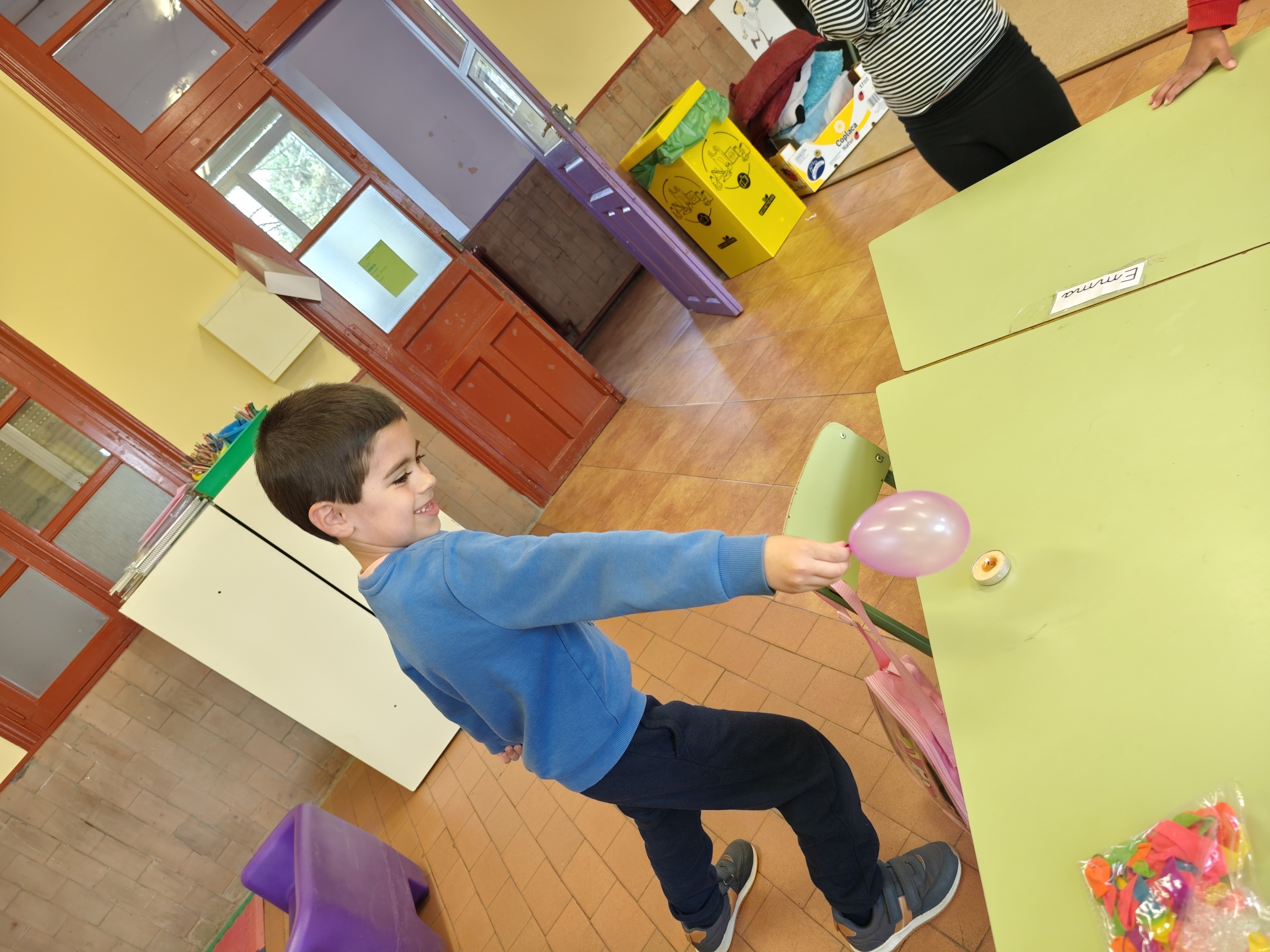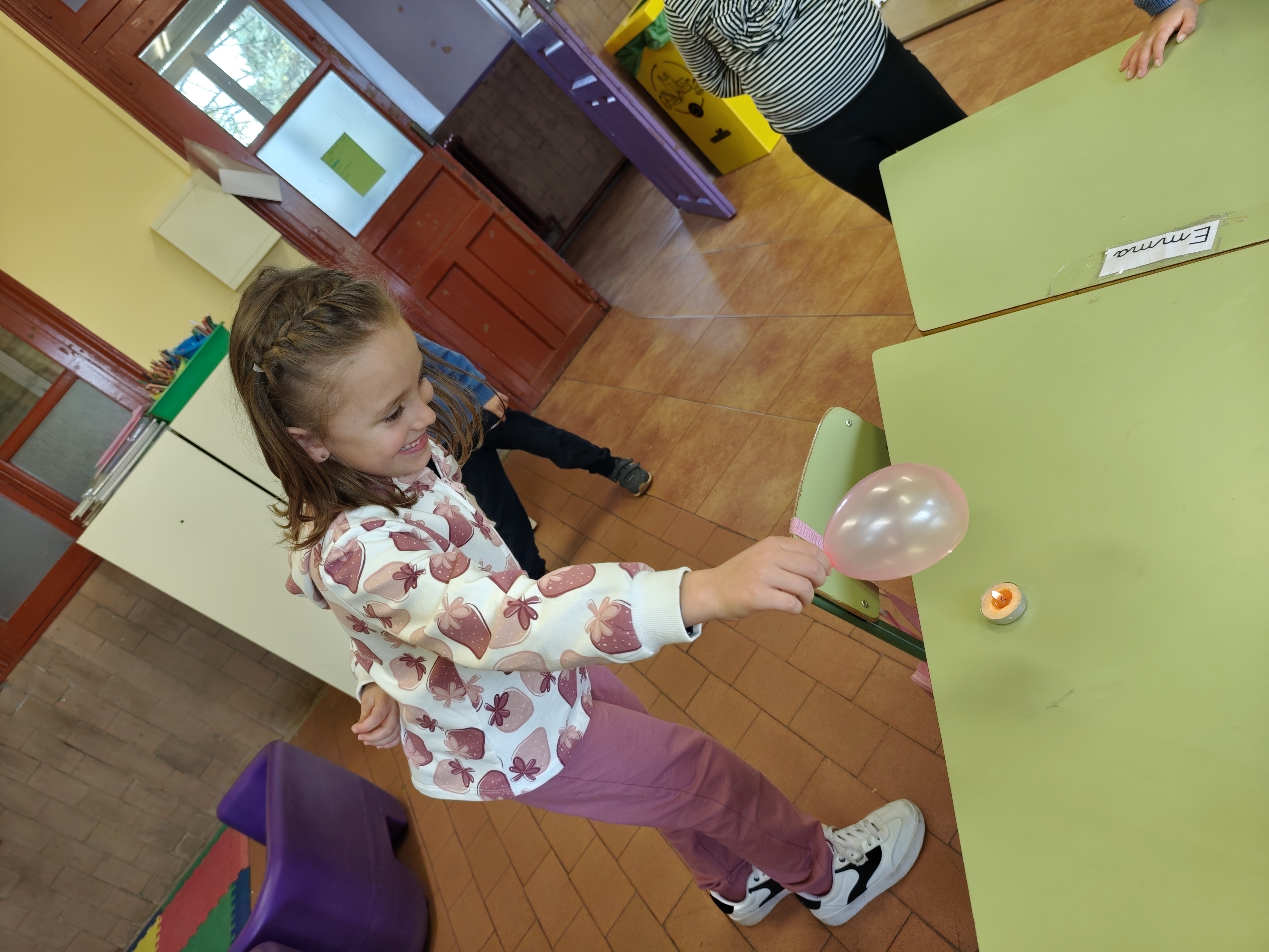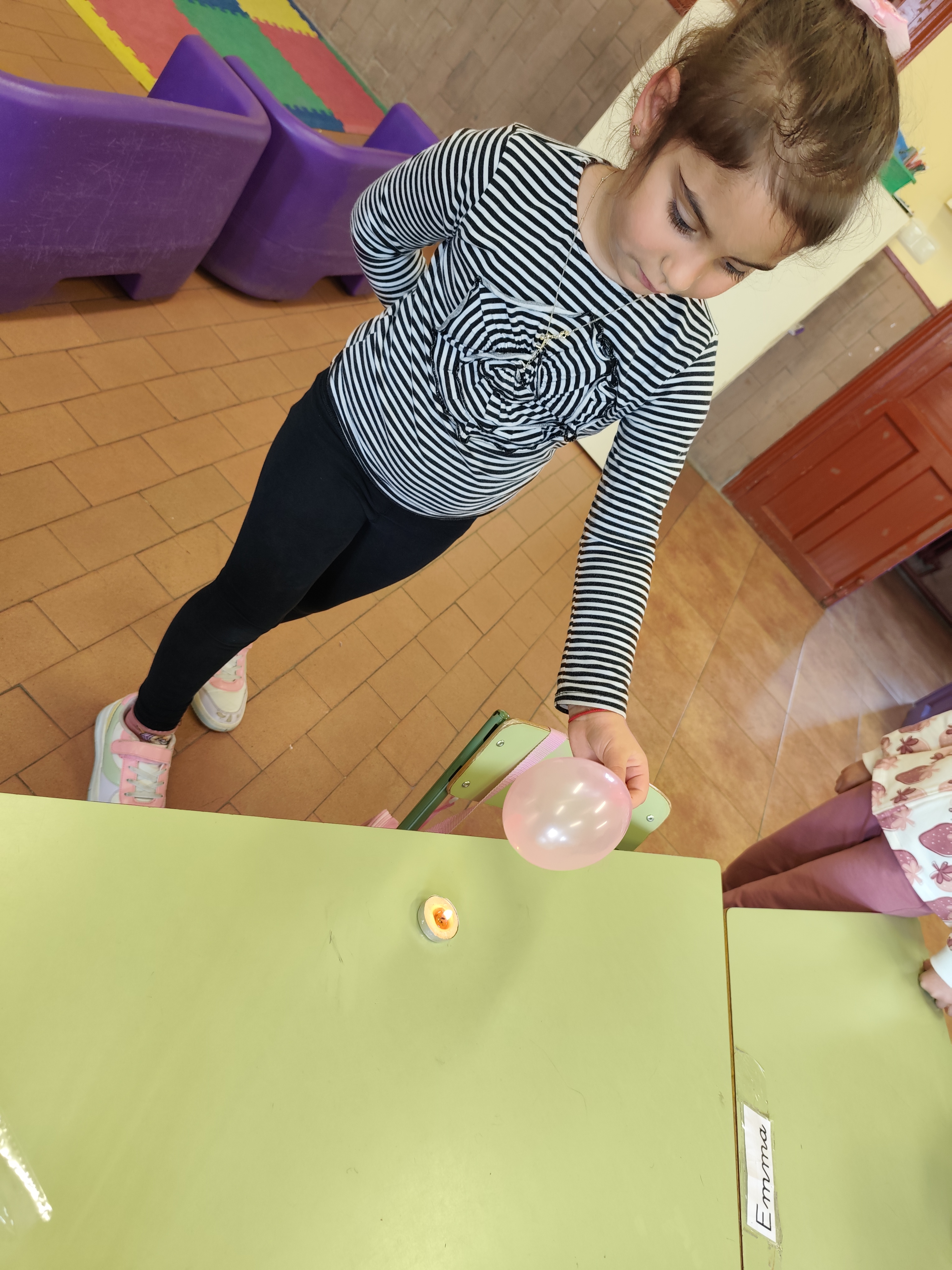Lo más interesante ha sido que hemos echado un poquito de agua en el globo y hemos vuelto a acercarlo a la vela encendida. Todos pensaban que el resultado iba a ser similar, el globo explota y además lo mojamos todo cuando con el agua que hay dentro. Pero hemos comprobado que no ha sido así y no hemos tenido que secar la mesa, el globo con agua ¡NO EXPLOTA!