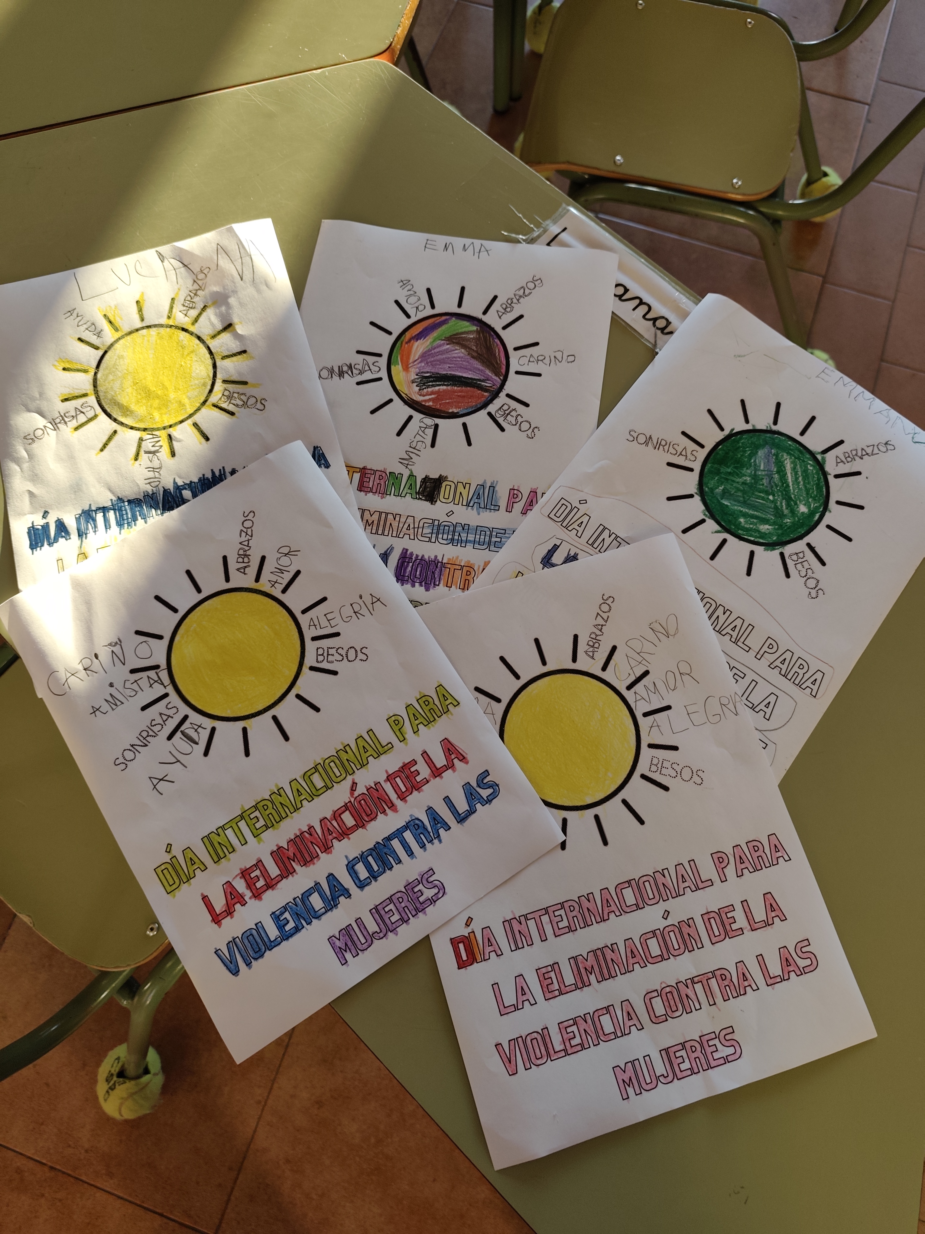 Además hemos escuchado el cuento "El sol y la luna" de Gianni Rodari y hemos descubierto que hay muchas cosas que por mucho que regalemos, no nos quedamos sin ellas, como besos, abrazos, sonrisas, caricias, ayuda... Podemos ayudar a eliminar la violencia repartiendo todos los días todas esas cosas, porque no se acaban.